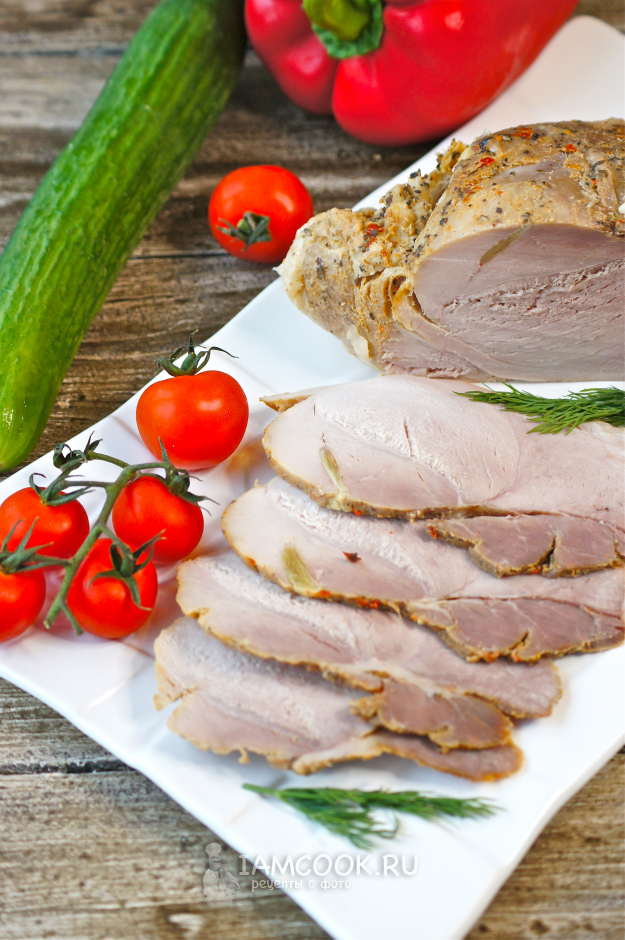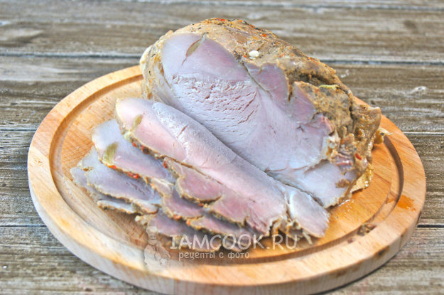 Затем нарежьте вареную буженину из свинины острым ножом и подайте с горчицей или хреном.