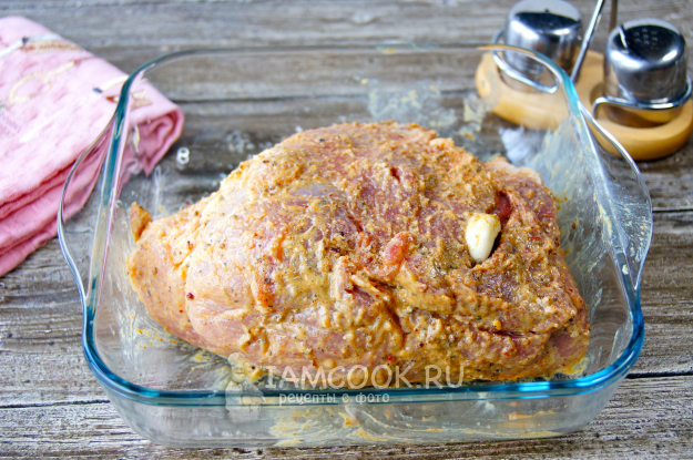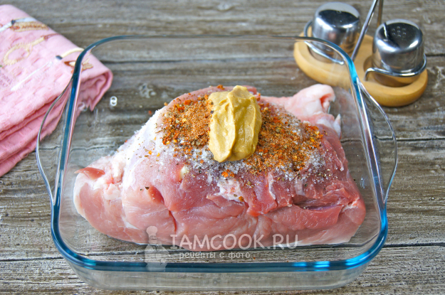 Хорошенько натрите со всех сторон горчицей, солью, перцем и специями для свинины.