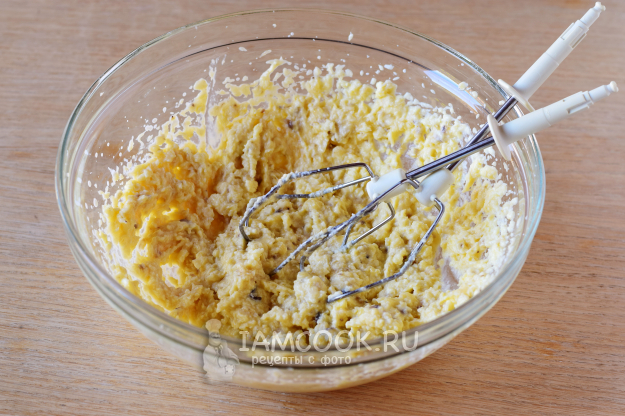 Миксером на средней скорости взбиваем сгущенное молоко и сливочное масло минуты 3-4, масса слегка посветлеет.