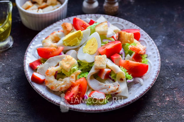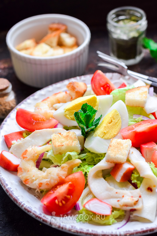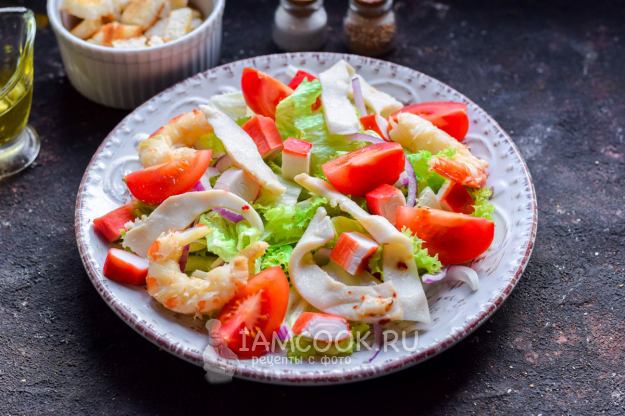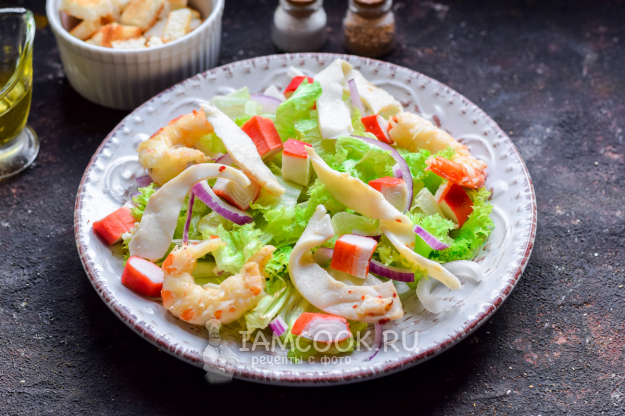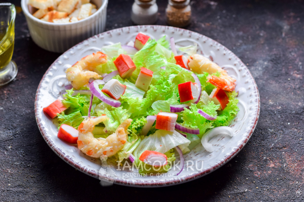 Крабовые палочки нарезать небольшими кусочками, переложить на салатные листья, добавить креветок.