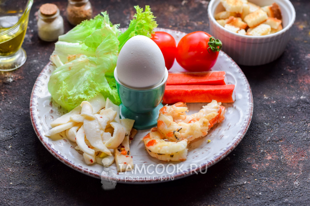 Подготовить все продукты для диетического салата с креветками и маринованными кальмарами. Креветок заранее отварить.