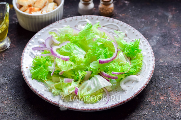 Взять тарелку для салата, выложить салатные листья, порвав их немного. Лук очистить и сполоснуть, нарезать полукольцами, выложить поверх салата.
