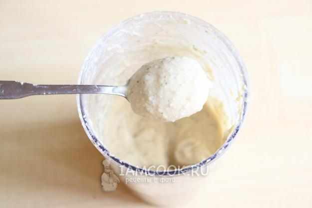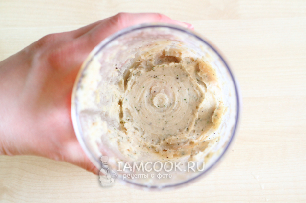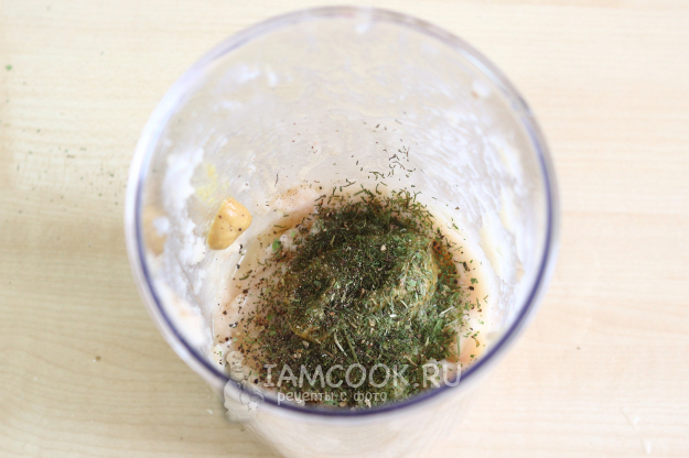 Пробиваем ингредиенты погружным блендером до однородности. Всыпаем специи по вкусу: сушеные укроп и петрушку, соль и черный молотый перец. А также добавляем сок лимона и горчицу (ориентируйтесь на свой вкус!).
