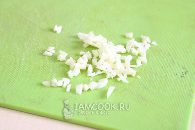 Зубчик чеснока очищаем и измельчаем ножом или в прессе для чеснока.