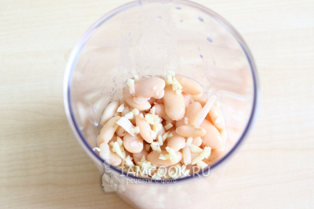 В чашу для взбивания майонеза выкладываем белую консервированную фасоль из банки без жидкости - из 400 граммов у меня осталось граммов 250, может выйти и больше, в зависимости от качества продукта.