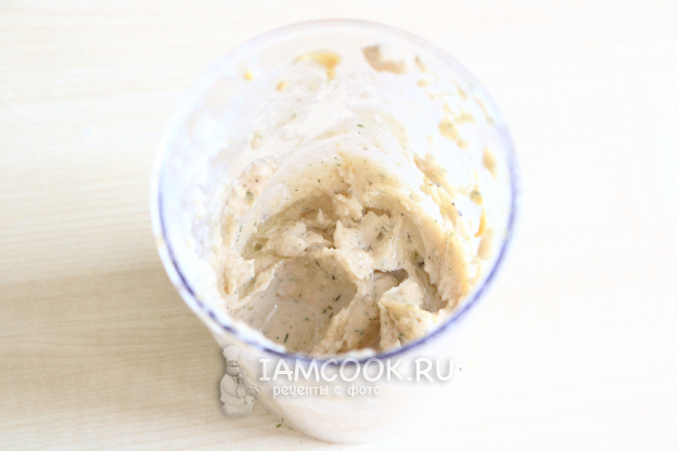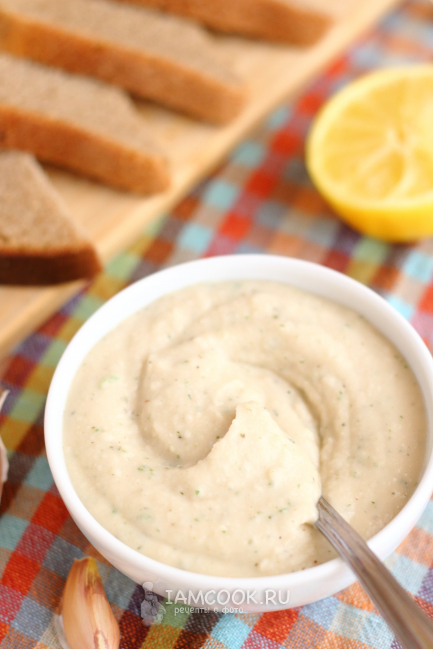 Вот таким, достаточно густым, получается готовый майонез. Для получения более жидкого соуса, добавьте жидкость от фасоли и ещё раз взбейте.