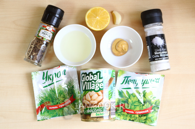 Для приготовления постного майонеза и консервированной белой фасоли в домашних условиях возьмём следующие компоненты.