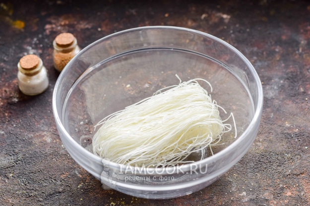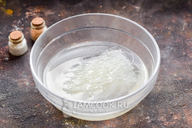 Фунчозу переложить в глубокую миску, отдельно довести до кипения воду, примерно 0,5-0,7 литра.