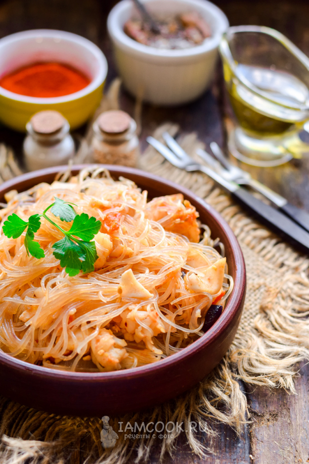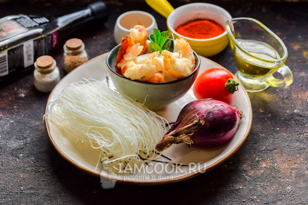 Возьмите все необходимые продукты для приготовления фунчозы с креветками и кальмарами на сковороде.