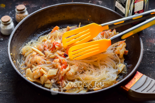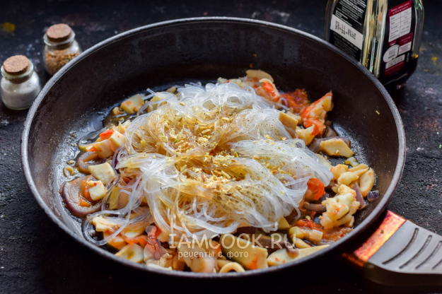 Добавить следом в сковороду фунчозу, соевый соус, соль, перец, сухой чеснок и паприку.
