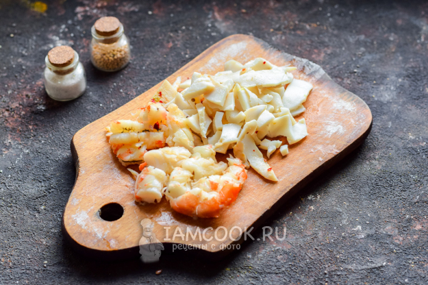 Креветок и кальмаров также нарезать небольшими кусочками.