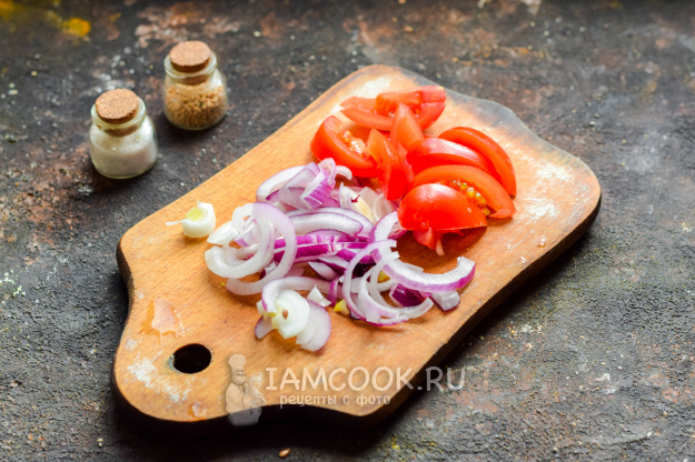 Очистить лук, сполоснуть и просушить. Нарезать лук полукольцами, помидоры черри нарезать дольками.