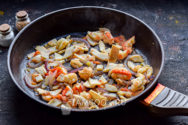 В сковороде прогреть масло, выложить лук, помидоры и морепродукты. Жарить все ингредиенты несколько минут.