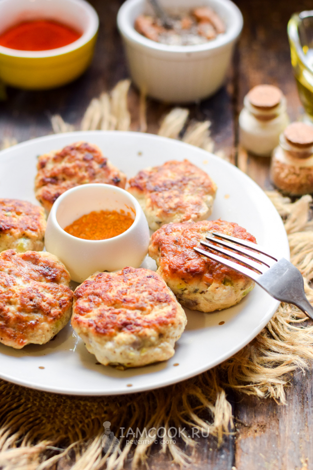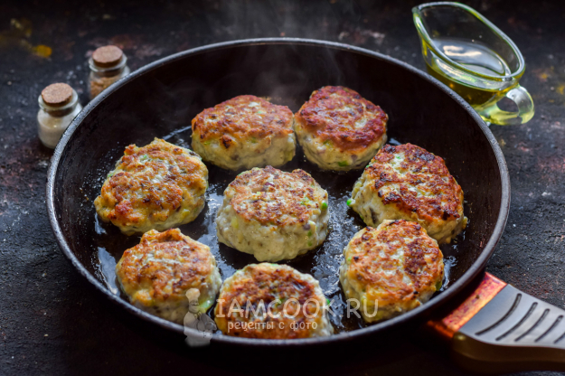 Сформировать небольшие котлеты. Сковороду разогреть, смазать маслом, жарить котлеты под крышкой по 10 минут, также можно дополнительно протушить 10 минут. Готовые котлеты из куриного филе с кабачками и шампиньонами подавать к столу.