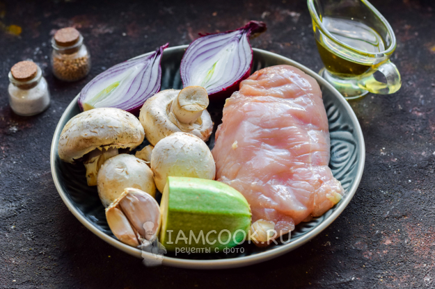 Продукты для приготовления куриных котлет с кабачками и грибами - перед вами.