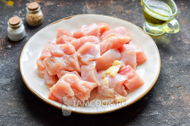 Куриное филе ополоснуть и просушить, нарезать средними по размеру кусочками.