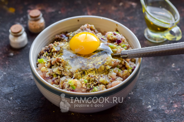 Добавить к фаршу куриное яйцо, всыпать соль и перец по своему вкусу. Тщательно все перемешать.