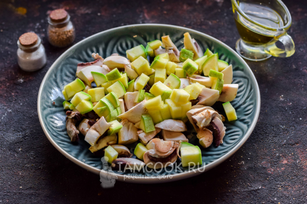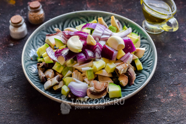 Шампиньоны и кабачки сполоснуть, просушить. Нарезать овощи произвольно.