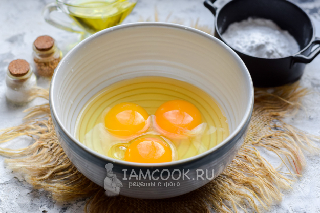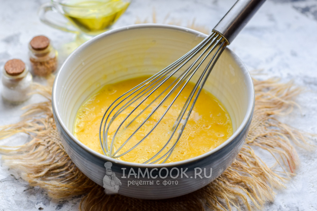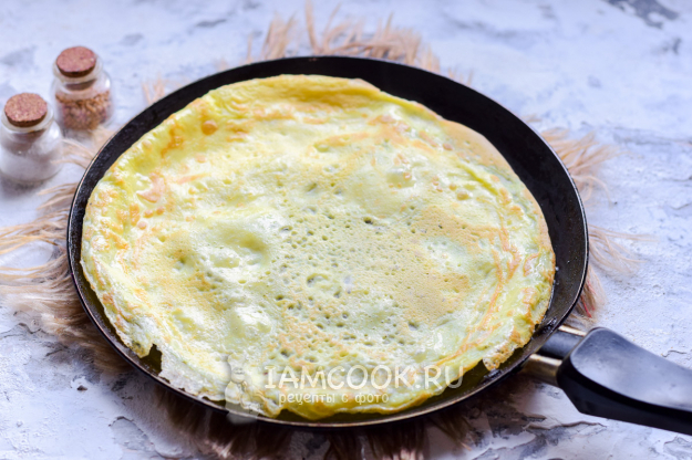 Прогреть сковороду, слегка смазать маслом, влить немного яичной смеси. Жарить тонкие блины с каждой стороны по 20 секунд.