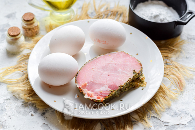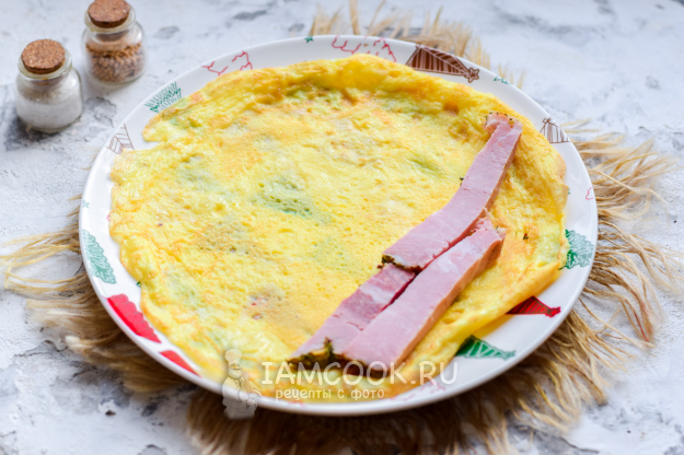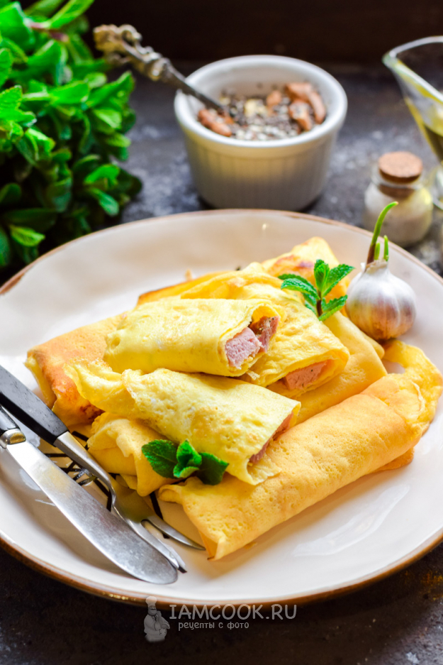 Буженину нарезать полосками, уложить на яичный блинчик.