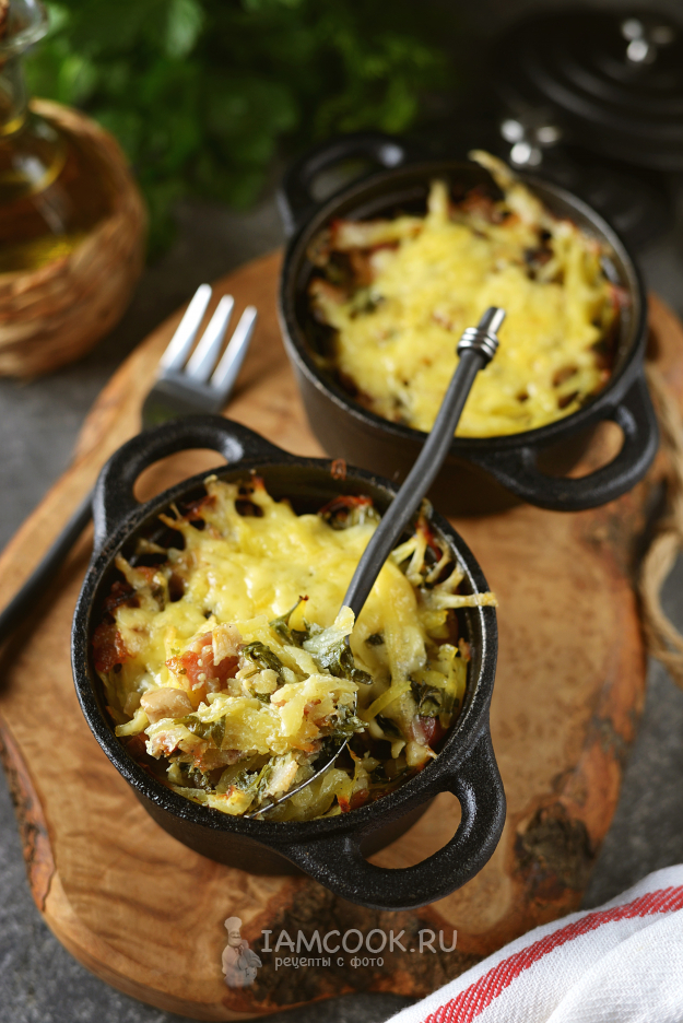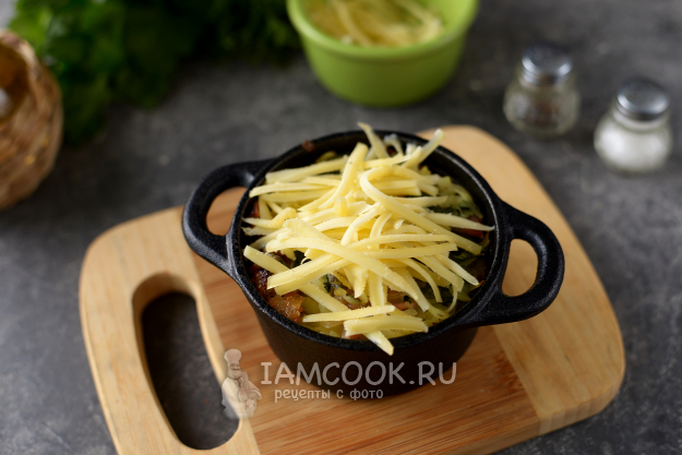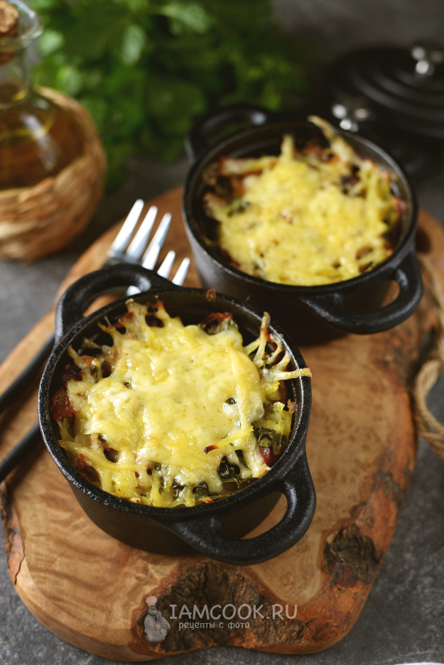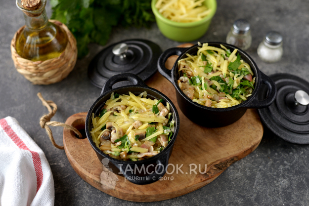 Разложите картофель в смазанные постным маслом порционные горшочки, накройте крышкой, отправьте в предварительно разогретую до 190 градусов духовку на 40-45 минут в режиме верхнего и нижнего нагрева. За это время бабка должна приготовиться, но все же ориентируйтесь на свою духовку.