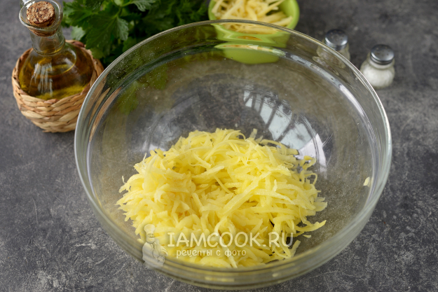 Картофель натрите на крупной терке, сложите в глубокую емкость, чуть посолите, через минут 5 отожмите всю лишнюю воду.