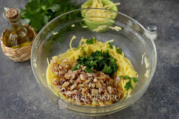 Добавьте остывший бекон с луком и грибами, а также нарубленную зелень. Еще раз все перемешайте. Бекон достаточно соленый, поэтому соль я больше не добавляла.