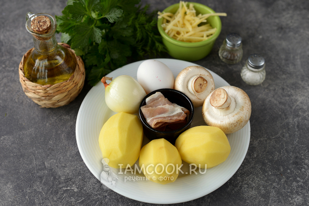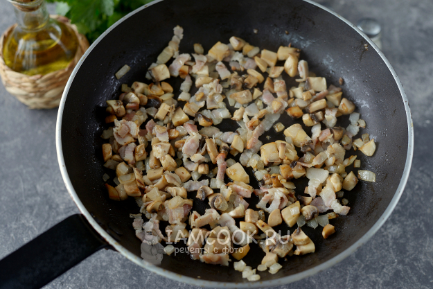 В небольшом количестве постного рафинированного масла обжарьте нарезанный мелким кубиком лук, грибы и бекон.