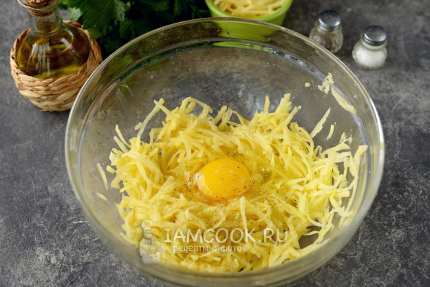 Вбейте в картофель яйцо, поперчите по вкусу, хорошенько перемешайте.