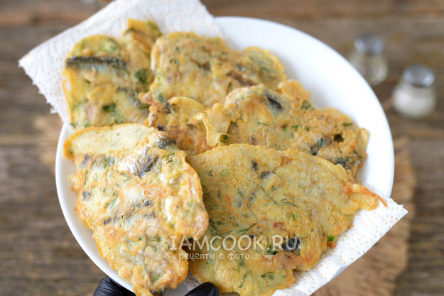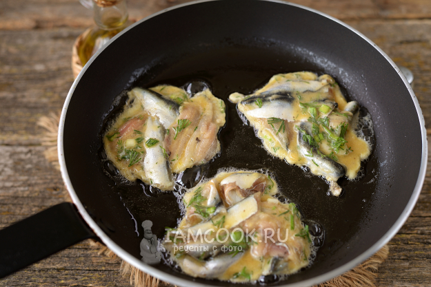 Разогрейте в сковороде постное рафинированное масло, выкладывайте по полной столовой ложке килек с кляром, обжаривайте на среднем огне до румяной корочки с обеих сторон. Минуты по 2-3 вполне достаточно.