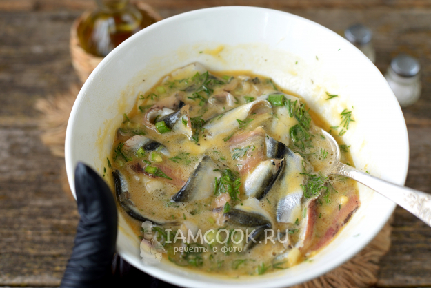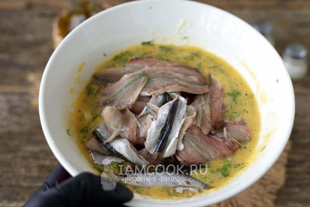 Выложите в кляр очищенное филе кильки.