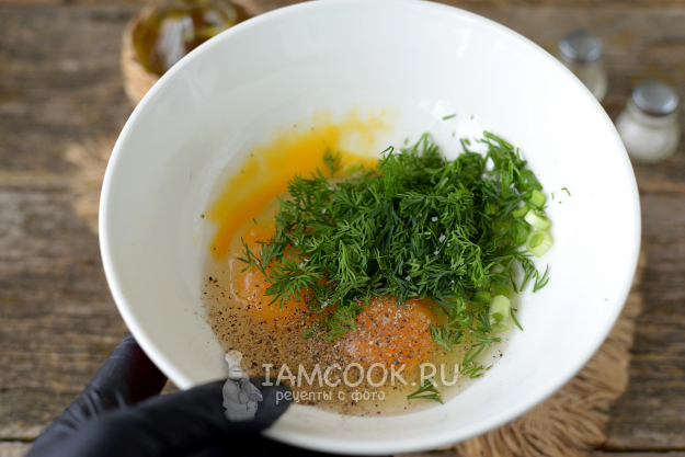 В удобной глубокой миске взбейте яйца, нарубленный зеленый лук и укроп. Добавьте соль и перец по вкусу.