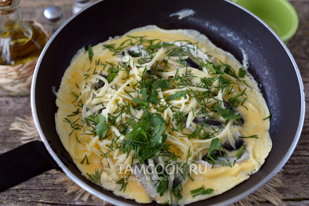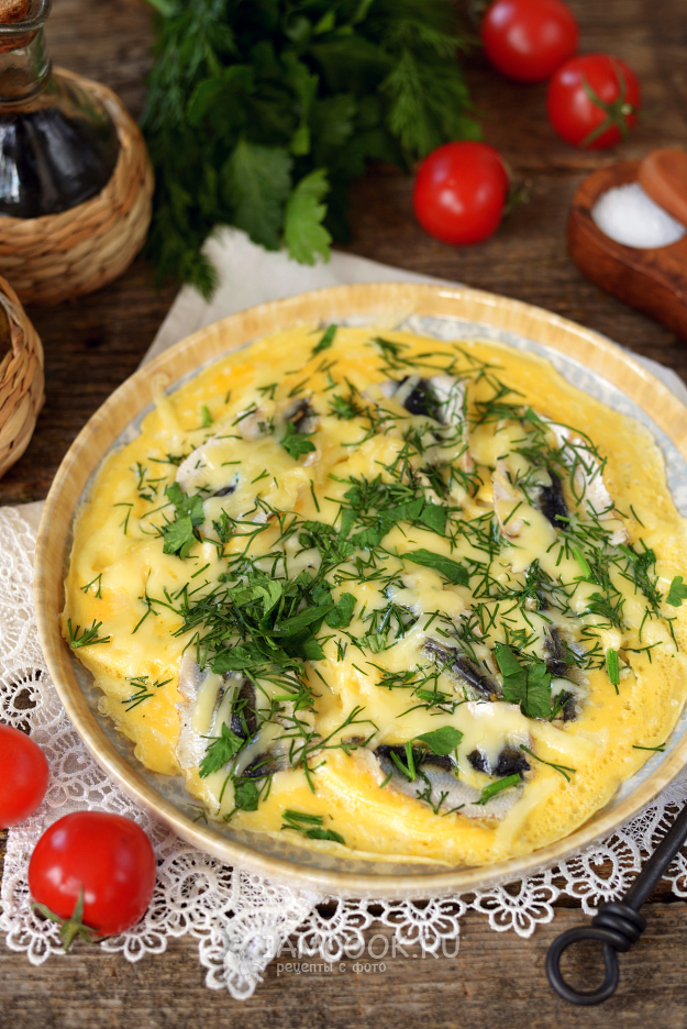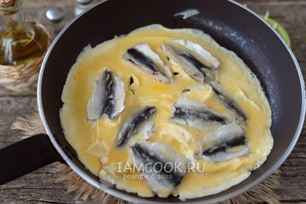 Омлет с килькой на сковороде готов. Он очень вкусный, рекомендую!