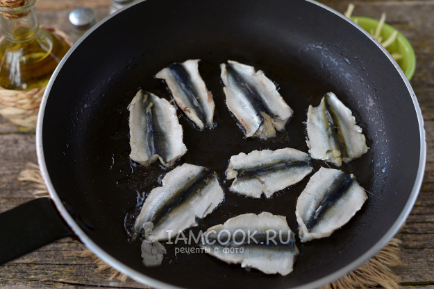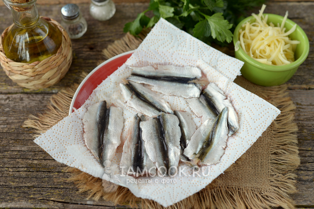 Кильку очистите от голов, внутренностей и хребта. Помойте под проточной водой, филе выложите на бумажные полотенца.