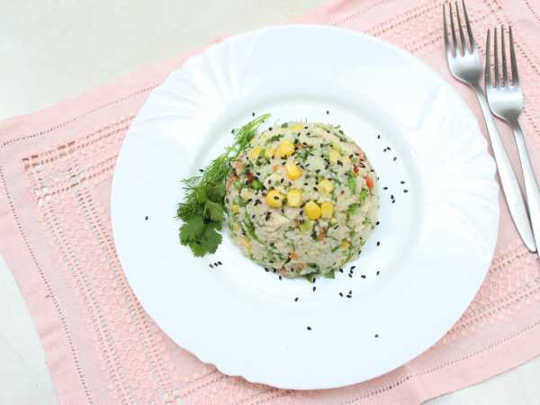 Кускус залейте кипятком, добавьте приправу с куркумой, паприкой или шафраном для цвета. Накройте крышкой, оставьте минут на 5 для набухания. Остудите полностью.