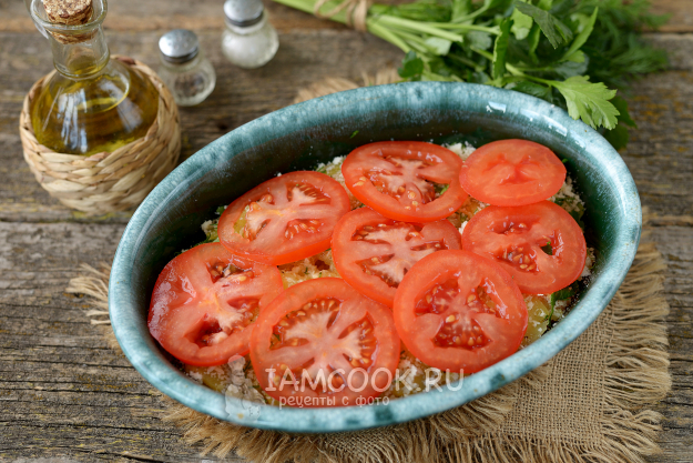 Дальше положите слой помидоров, накройте их оставшейся килькой. Каждый слой можно чуть посолить и поперчить.