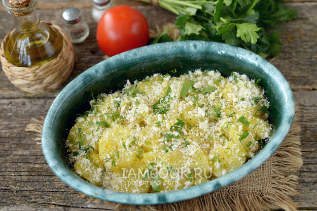Смажьте форму для выпечки любым постным маслом, посыпьте сухарями с пармезаном и зеленью.