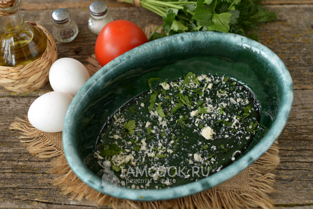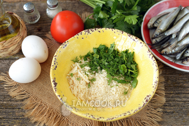 Нарубите свежий укроп и петрушку, смешайте в глубокой миске ее вместе с сухарями и пармезаном.