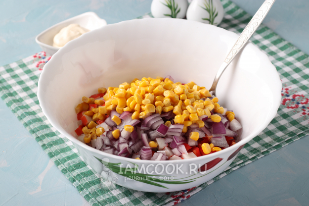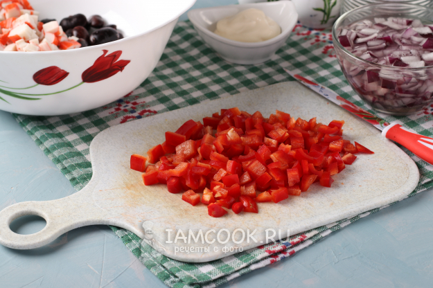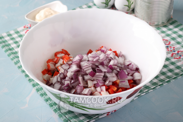 Сложить в салатник фасоль, крабовые палочки и перец. С лука слить воду, промыть его холодной кипячёной водой и добавить в салат.