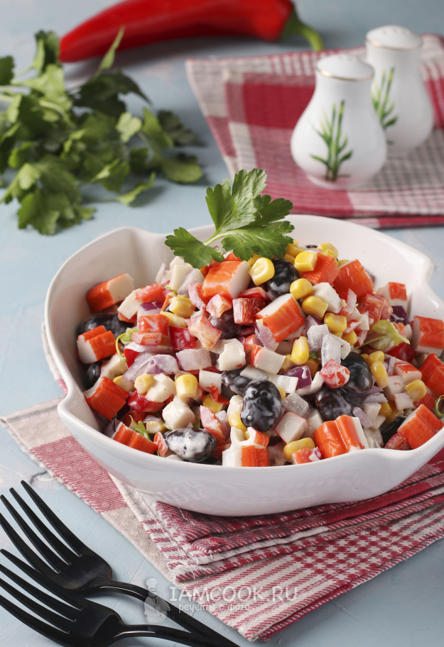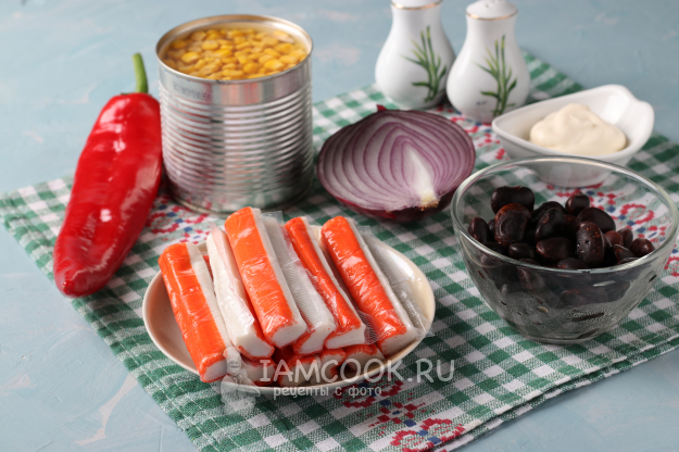 Для приготовления салата с фасолью, кукурузой и крабовыми палочками подготовить из списка необходимые ингредиенты.
