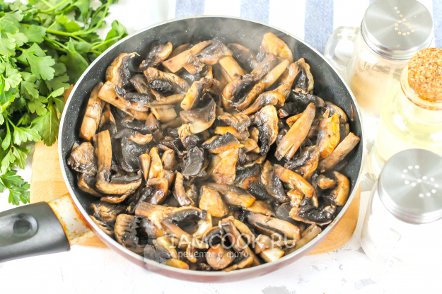 Промойте шампиньоны в воде, нарежьте слайсами. Влейте на сковороду растительное масло, оставив 1 ст.л. для заправки блюда. Выложите грибную нарезку, посолите ее и обжарьте примерно 5-7 минут до румяности. Нужно, чтобы из нарезки выпарилась жидкость.