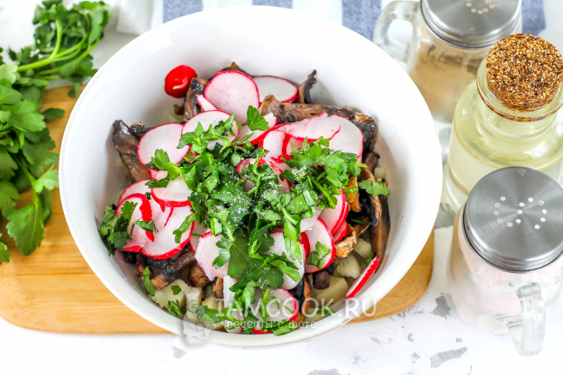 Промойте свежую петрушку, измельчите и всыпьте в емкость вместе с солью. Влейте растительное масло и аккуратно перемешайте салат.