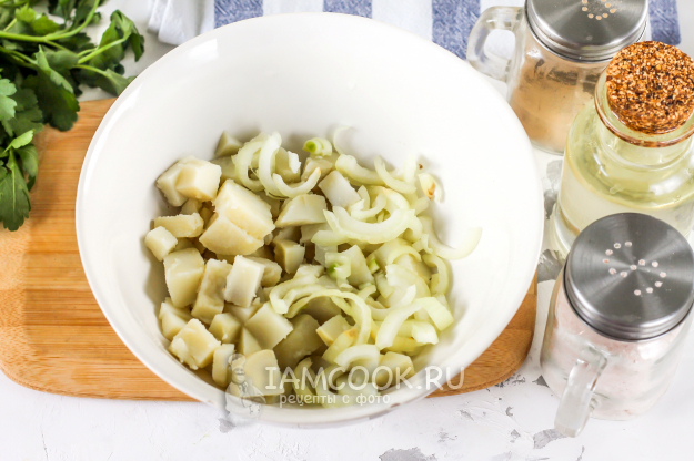Отварной картофель очистите от кожуры, промойте в воде. Нарежьте мелкими или средними кубиками и высыпьте в глубокую емкость. Лук очистите от кожуры, промойте в воде и нарежьте полукольцами. Добавьте к картофельной нарезке.