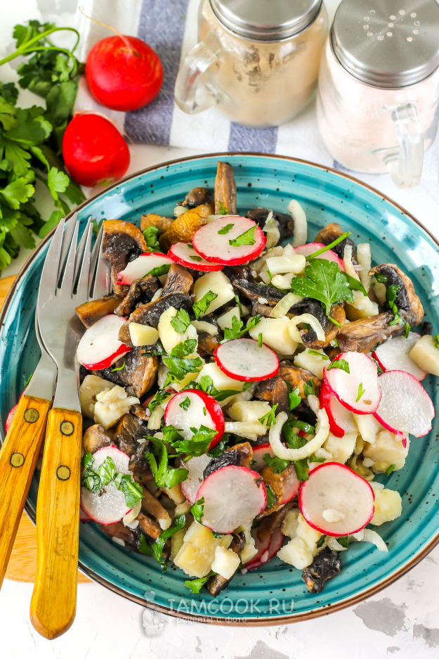Итак, подготовьте необходимые ингредиенты для картофельного салата с грибами и редисом и начнем кулинарить!