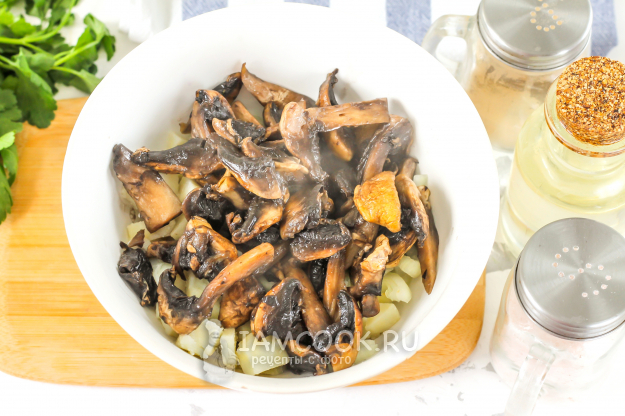 Выложите обжаренные грибы в глубокую емкость и дайте остыть примерно 15-20 минут.