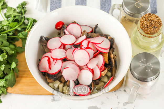 Промойте редис и срежьте с корнеплодов хвостики. Нарежьте кольцами или полукольцами - по желанию. Добавьте нарезку в емкость к остальным ингредиентам.
