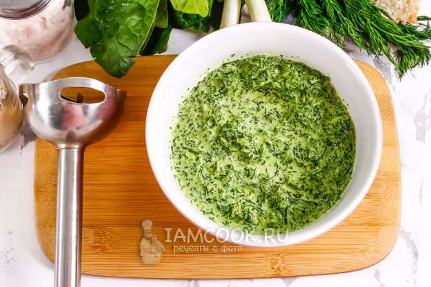 Сметану выложите в глубокую емкость. Всыпьте соль. Промойте свежую зелень и нарежьте, добавьте к сметане и измельчите все погружным блендером, превращая в красочный соус. Цвет ему придаст шпинат.