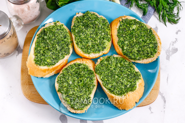 Нарежьте багет ломтиками толщиной не меньше 1 см. Обмажьте их приготовленным соусом из зелени.