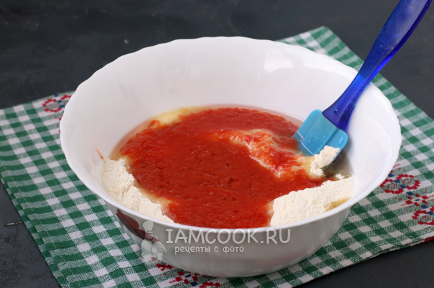 Сделать в центре углубление и вылить растительное масло и томатный сок. Быстро перемешать лопаткой.