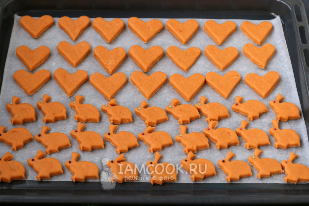 Противень застелить пергаментом и разложить на нём заготовки. Не бойтесь раскладывать печенье близко друг к другу, при выпекании оно растёт вверх.
